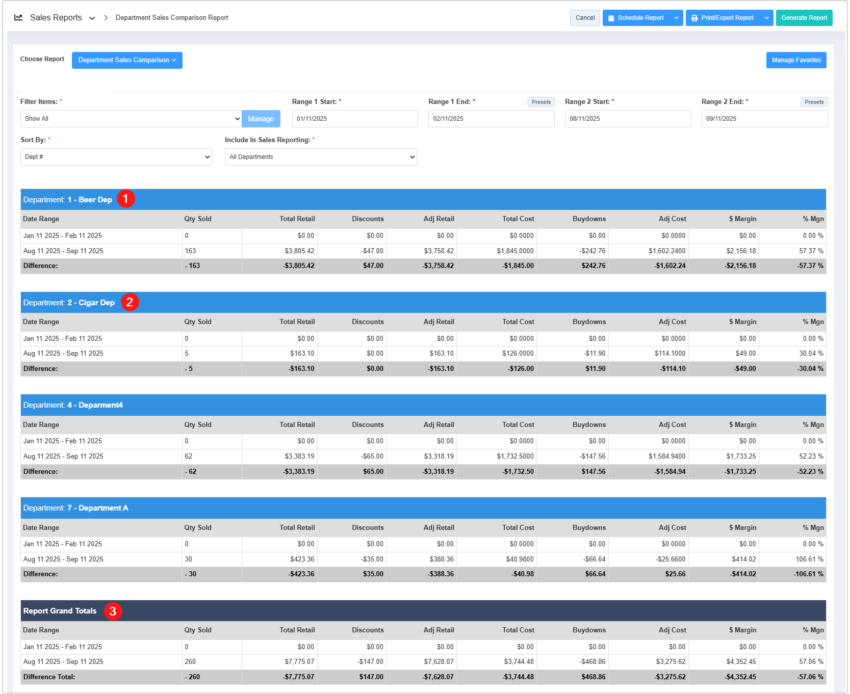 3: Report Grand Totals: This section shows the total sales of all/selected departments during the specified date range. It will appear at the end of the report. If there are a hundred departments, it will appear at the end of the comparison section of those hundred departments.