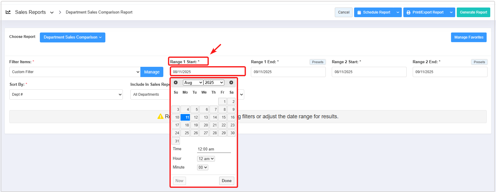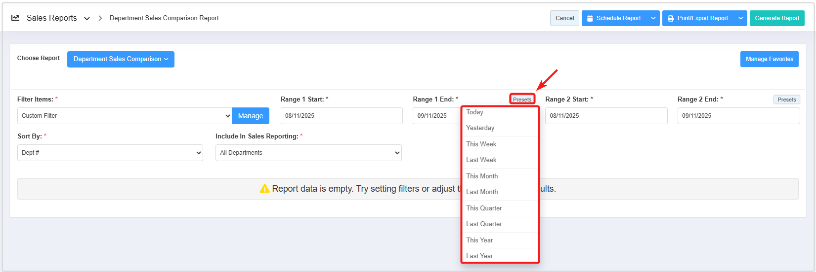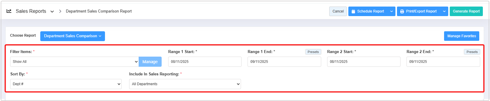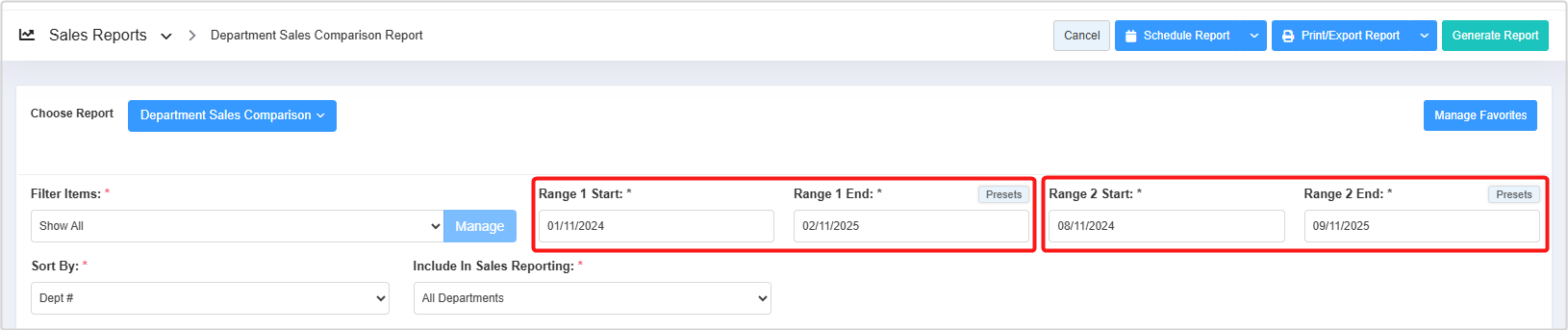 - How to generate the "Department Sales Comparison Report" for the selected date range