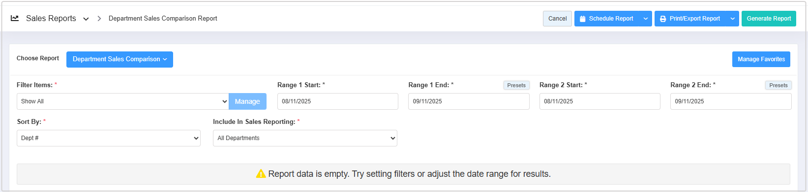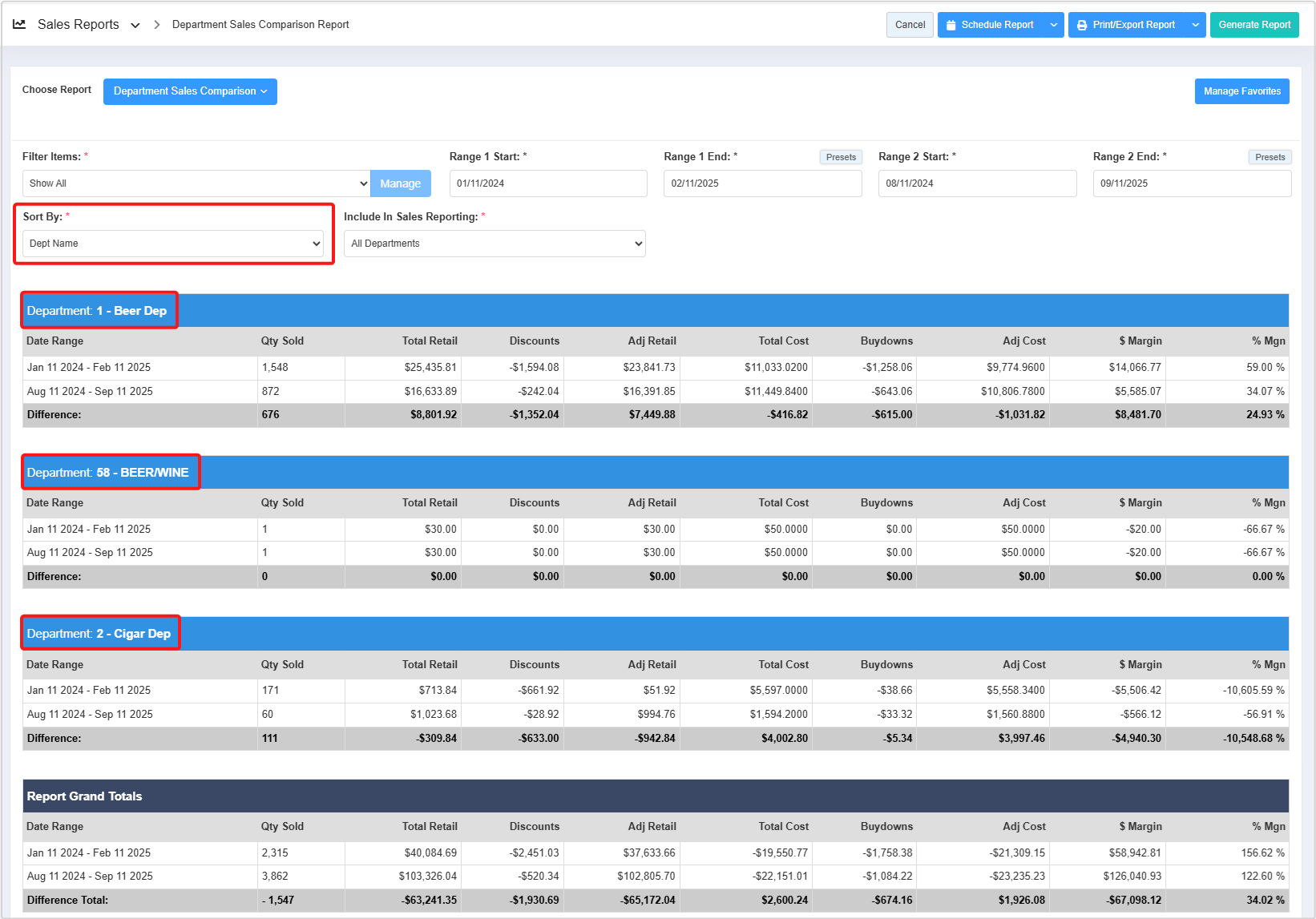 - Click "Generate Report" to view the Department Sales Comparison Report for the selected date ranges.