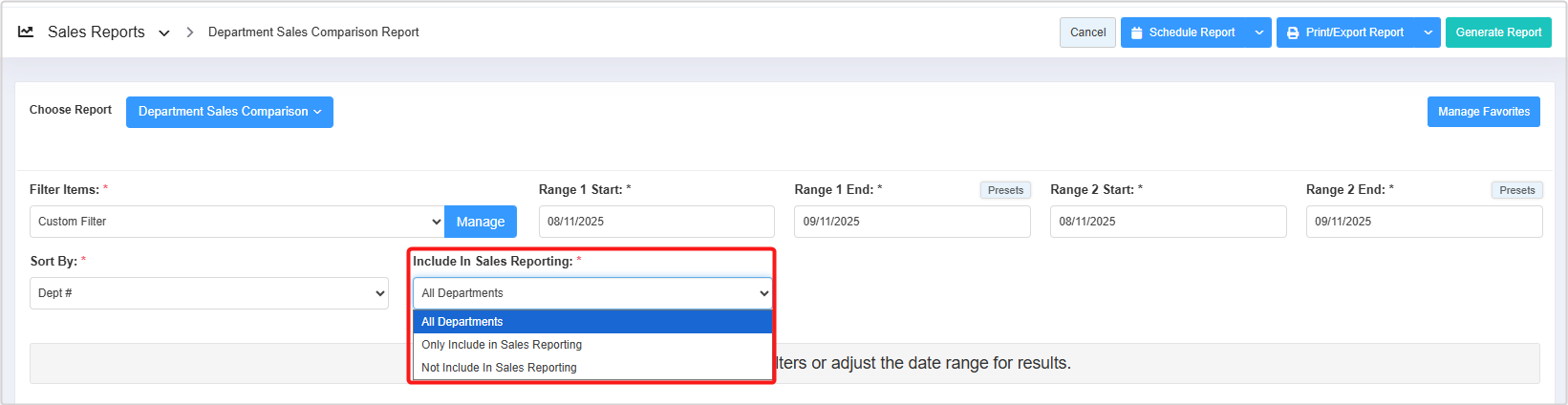 The Include In Sales Reporting drop-down allows you to filter the report records based on three parameters: All Departments, Only Include in Sales Reporting, and Not Include In Sales Reporting.