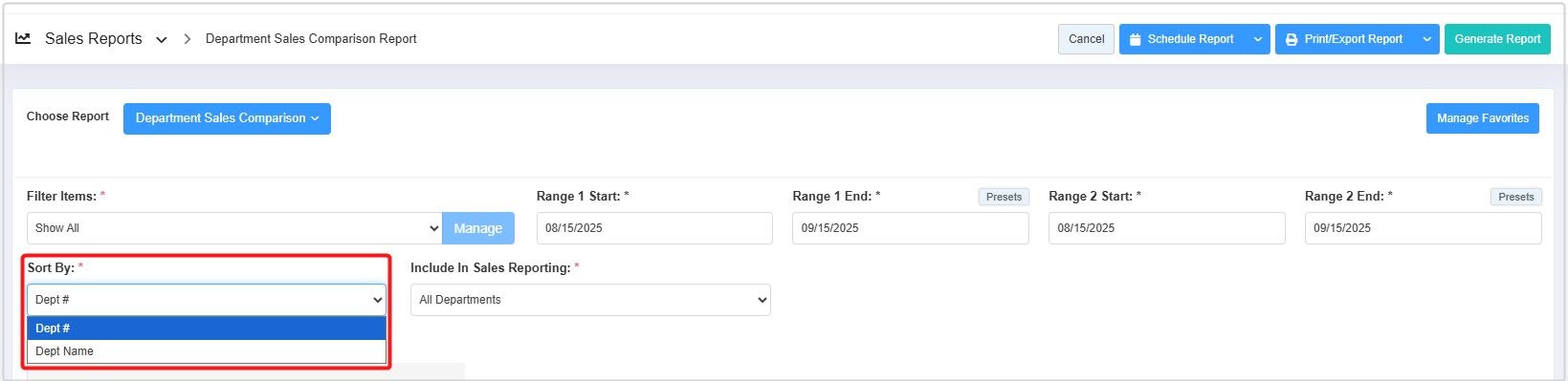 - Sort By: This filter lets you arrange the report records based on two parameters: the department number in ascending order and the department name in alphabetical order. 3.3 Sort By explains the further details.
