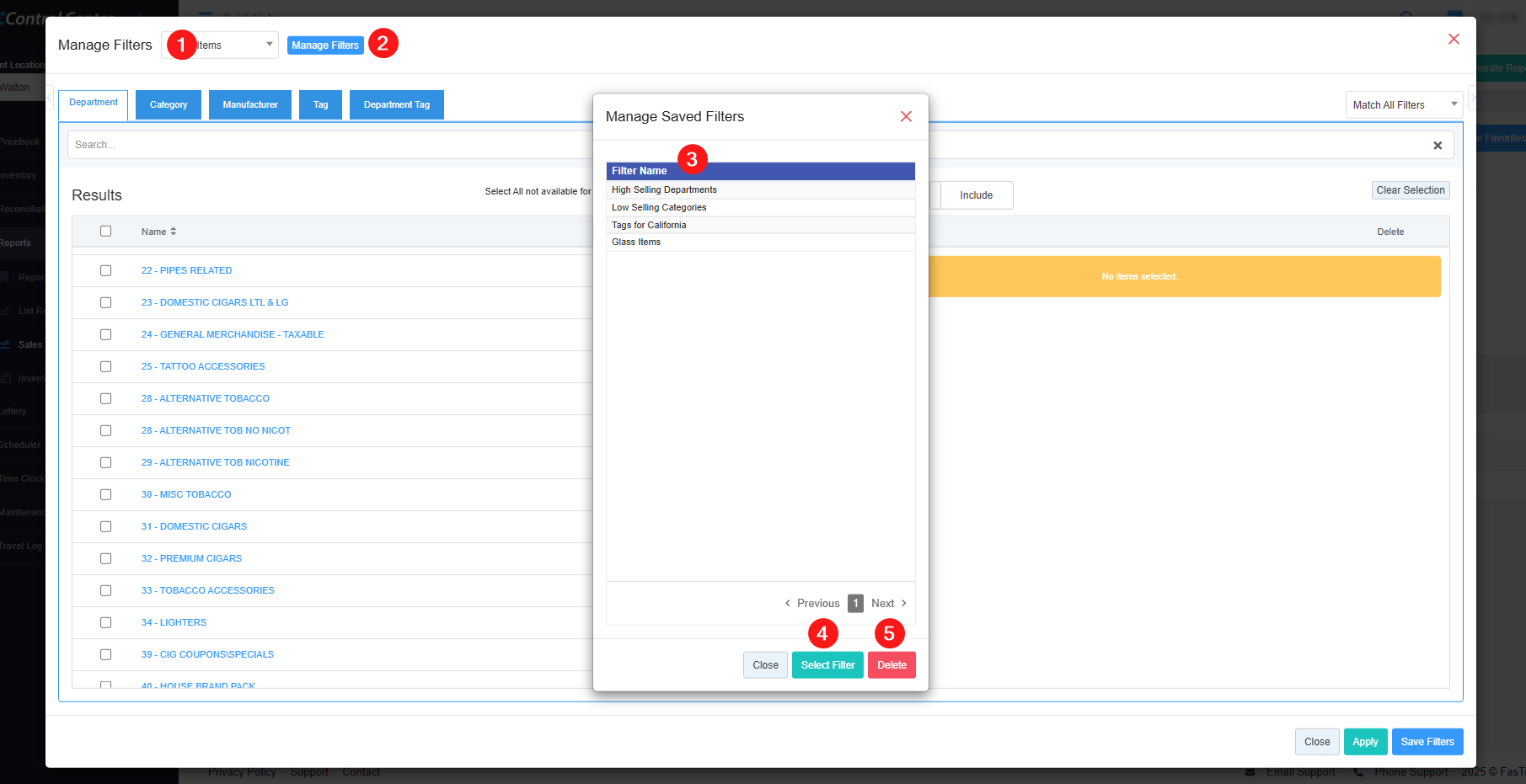 - Filter Items: Filter Items lets you select the report data based on five parameters: Department, Category, Manufacturer, Tag, and Department Tag. 3.1 Filter Items (Custom Filters) explains the further details.