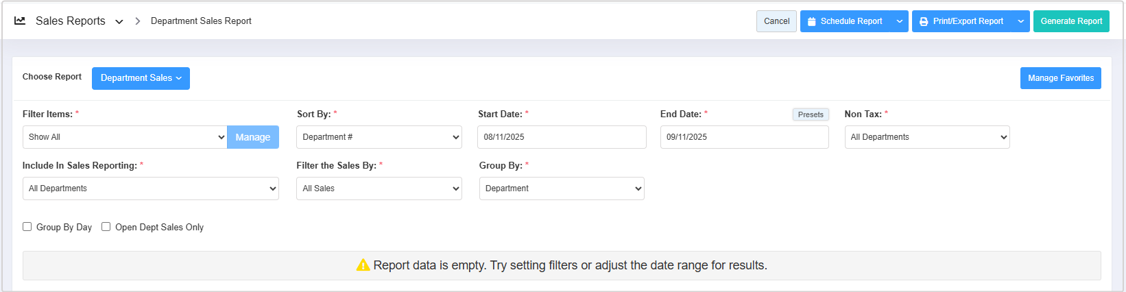- Open Dept Sales Only: This checkbox allows you to view sales recorded under Open Department Sales.