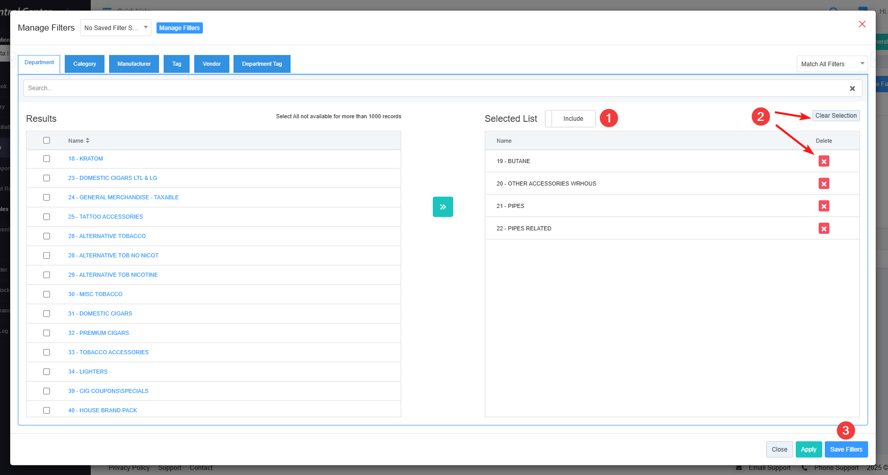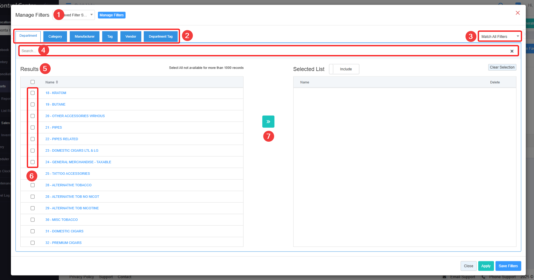 - 2: Parameter Tabs: You will see six tabs: Department, Category, Manufacturer, Tag, Vendor, and Department Tag. Select the required tab, i.e., "Department," to create or apply a custom filter specific to the selected Departments.