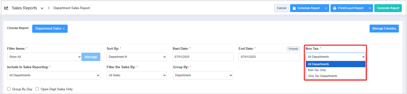 - Non-Tax Only: Select the "Non-Tax Only" option to include only non-taxable departments' data in the report.
