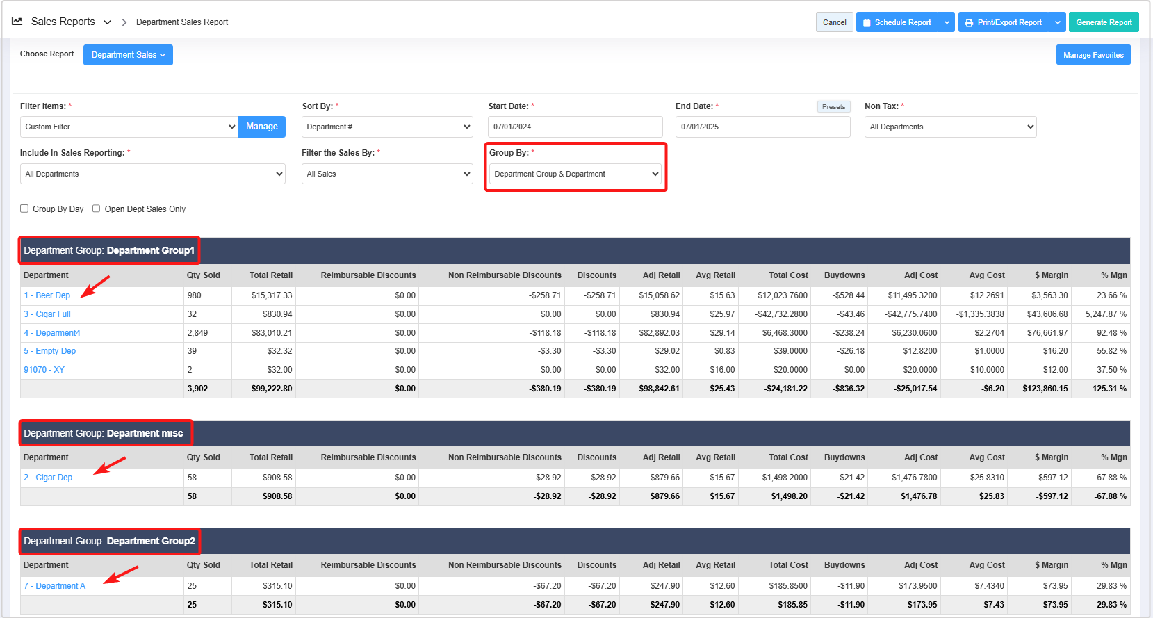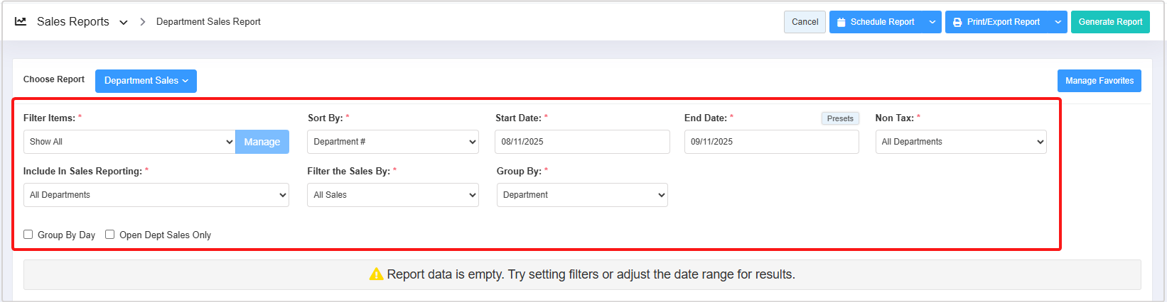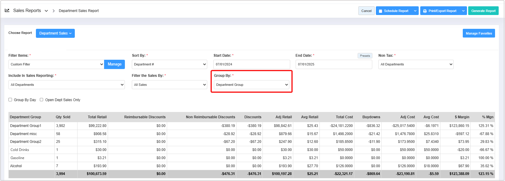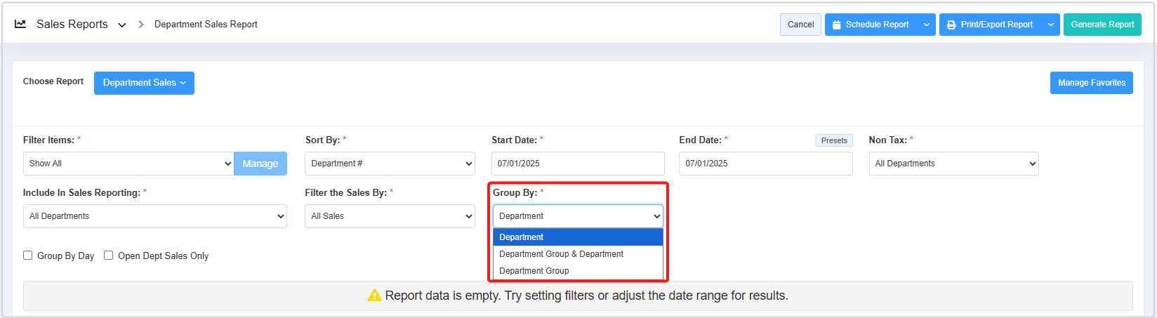- Group By Day: This checkbox enables you to view sales data for each department group, organized by individual days.