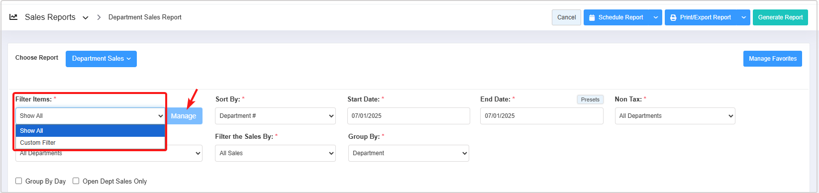 - 1: Manage Filters Drop-Down: Select the saved custom filters from the Manage Filters drop-down (if any) and click "Apply" to apply the saved custom filter. The system will redirect you to the Department Sales Report home screen. Click "Generate Report" to generate the report for the selected filter. Clicking the "Manage Filters" button will also open the list of saved custom filters.