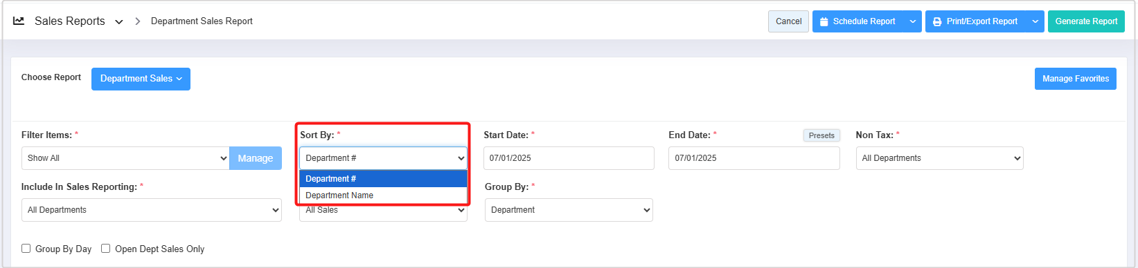 - Only Tax Departments: Select the "Only Tax Departments" option to include taxable department data in the report.