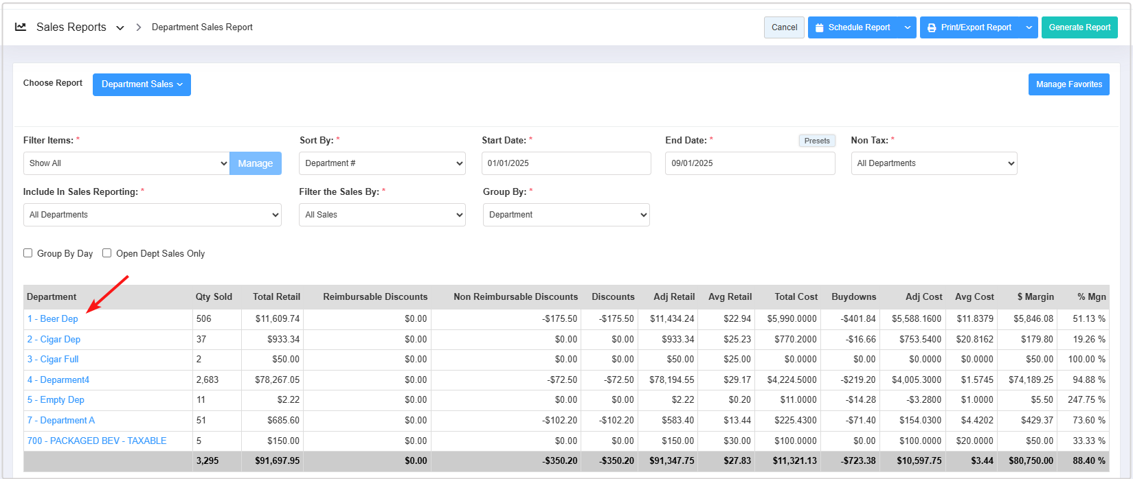 - By simply clicking on a department's name in the Department column, you can quickly access the list of items sold and their respective sales data for that department.