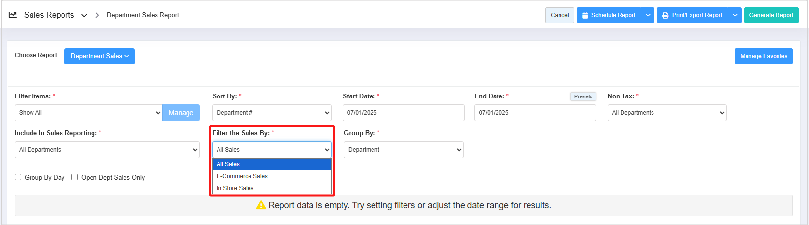 - Include in Sales Reporting: This filter allows you to filter department sales records based on three parameters: All Departments, Only Include in Sales Reporting, and Not Include in Sales Reporting. Section 3.5 Include In Sales Reporting provides further details.