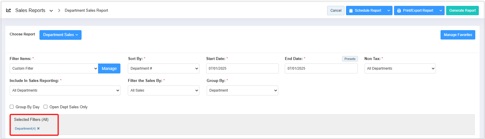 - To generate the Department Sales Report with the specific data you've selected, apply a selection or choose a saved filter, then click the "Generate Report" button. The selected filter details are available under the Selected Filters (All) label, as shown in Figure 3.1.1.3.