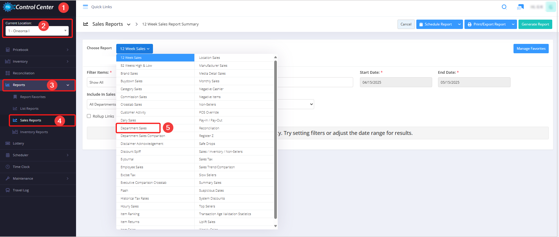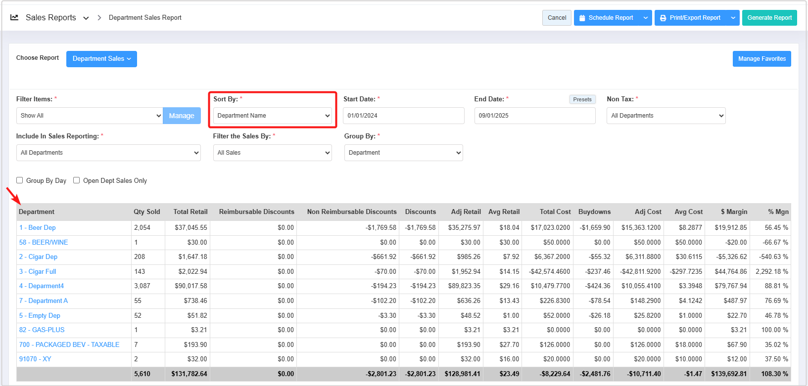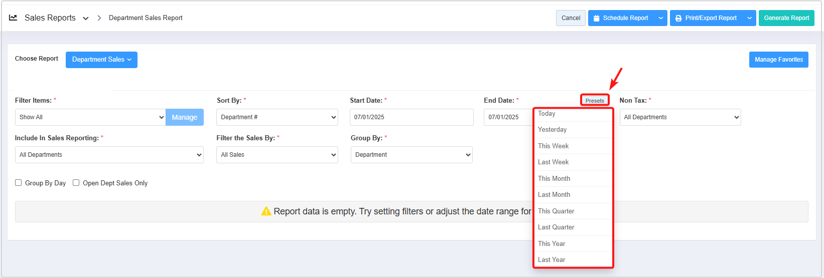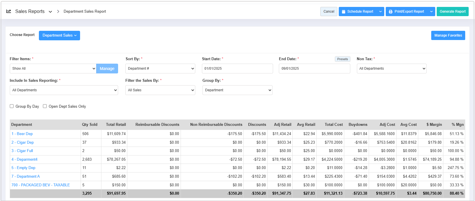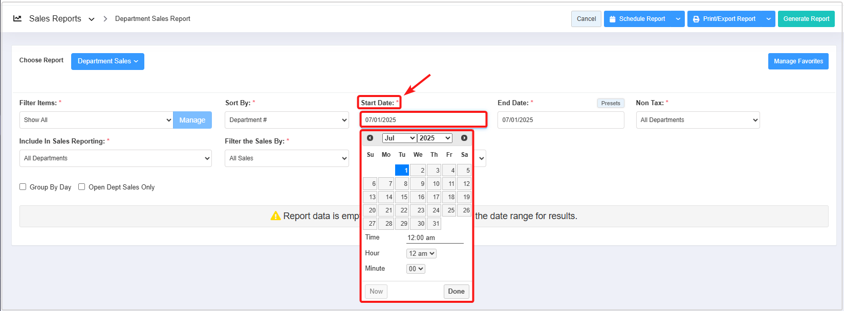 - Select the desired date range and click "Generate Report" to view the Department Sales Report for that specific date range.