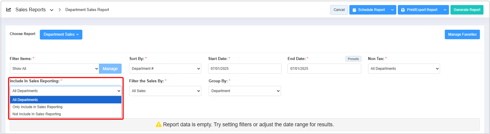 The Include In Sales Reporting drop-down allows you to filter the report records based on three parameters: All Departments, Only Include in Sales Reporting, and Not Include in Sales Reporting.