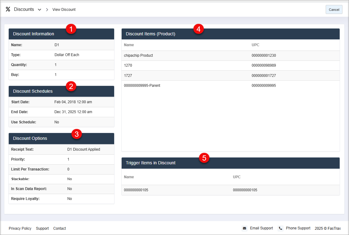 This screen represents the View Discount interface in FTx Cloud POS and is used to view detailed configuration and item association for a specific discount. It is intended for users with view-only access or those verifying existing discount setups.