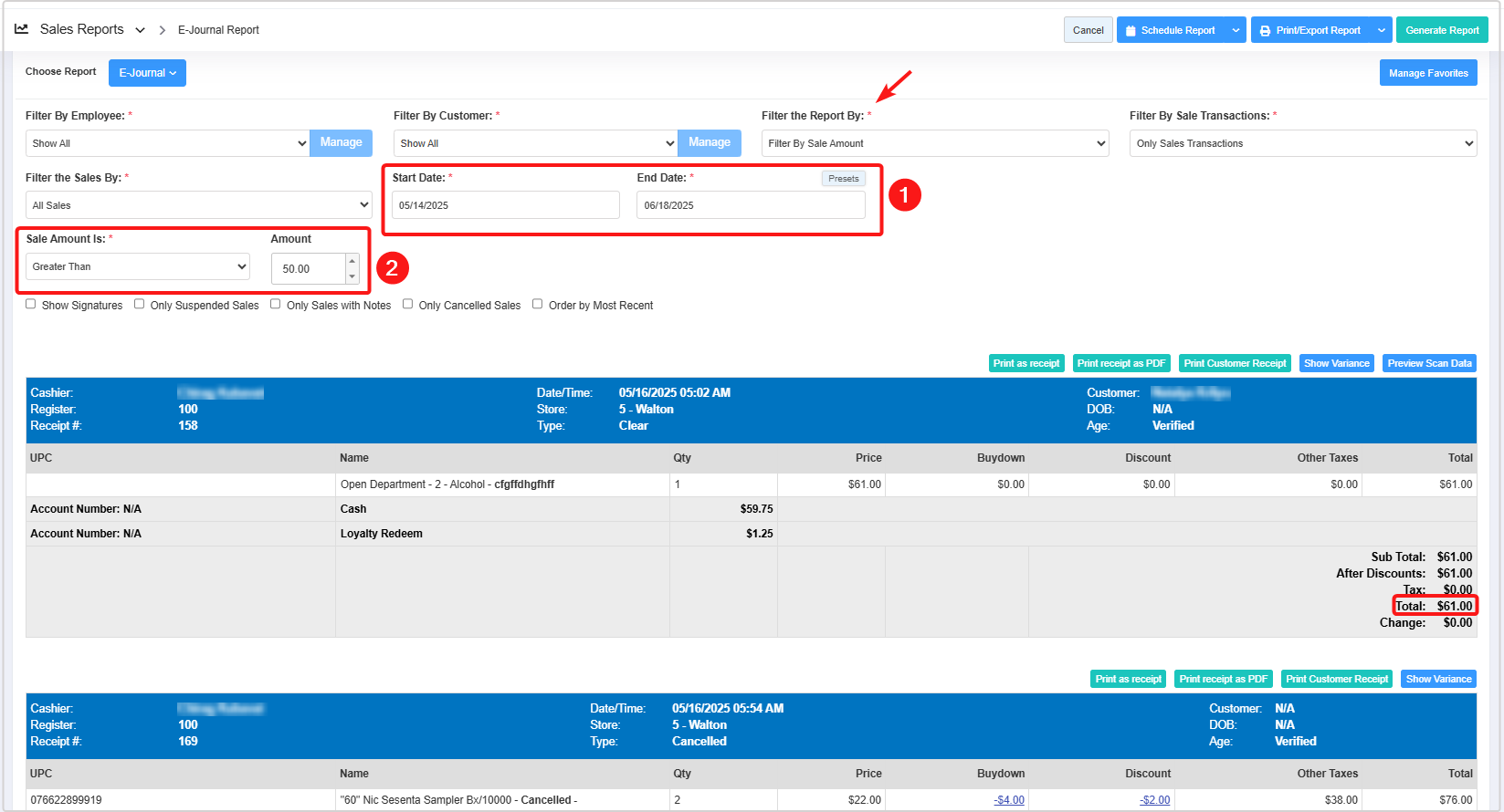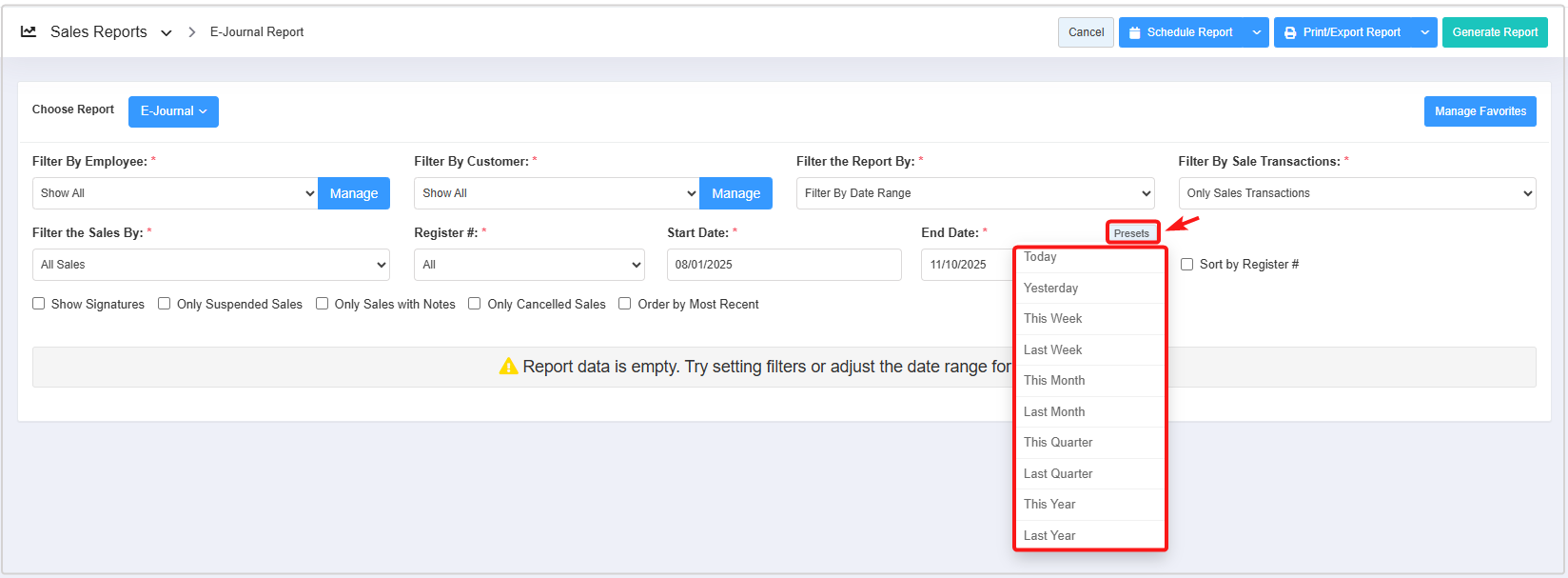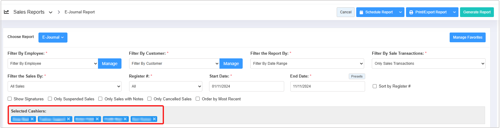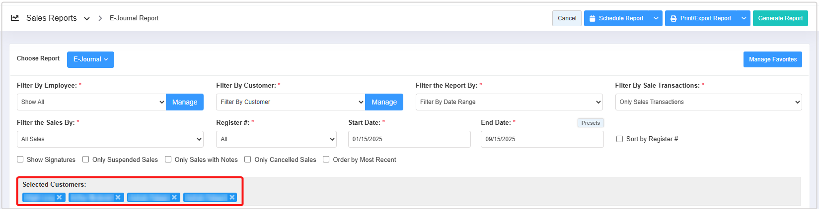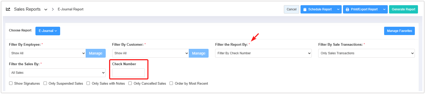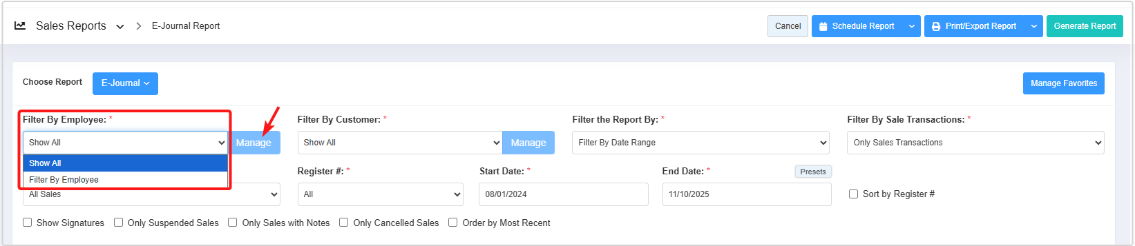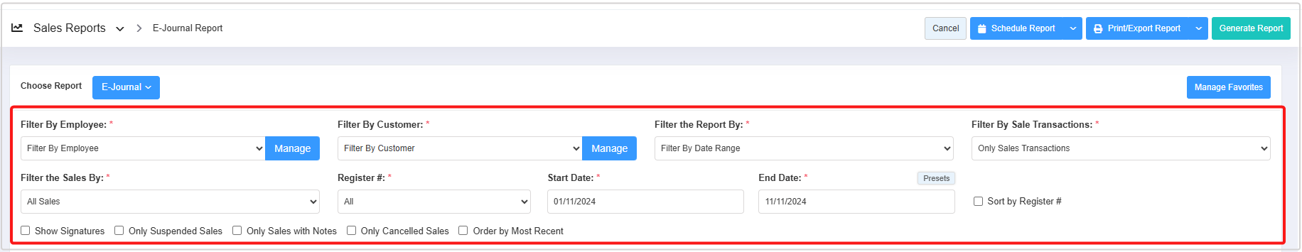 - You can use the Filter By Employee, Filter By Customer, Filter the Report By, Filter By Sales Transactions, Filter the Sales By, Register#, and Date Range & Presets filters and Sort by Register#, Show Signature, Only Suspended Sales, Only Sales with Notes, Only Cancelled Sales, and Order by Most Recent checkbox filters to create the report that meets your requirements. You can use multiple filters to make the report more specific. Please refer to Section 3, Report Filter Options, to learn more about these filters.