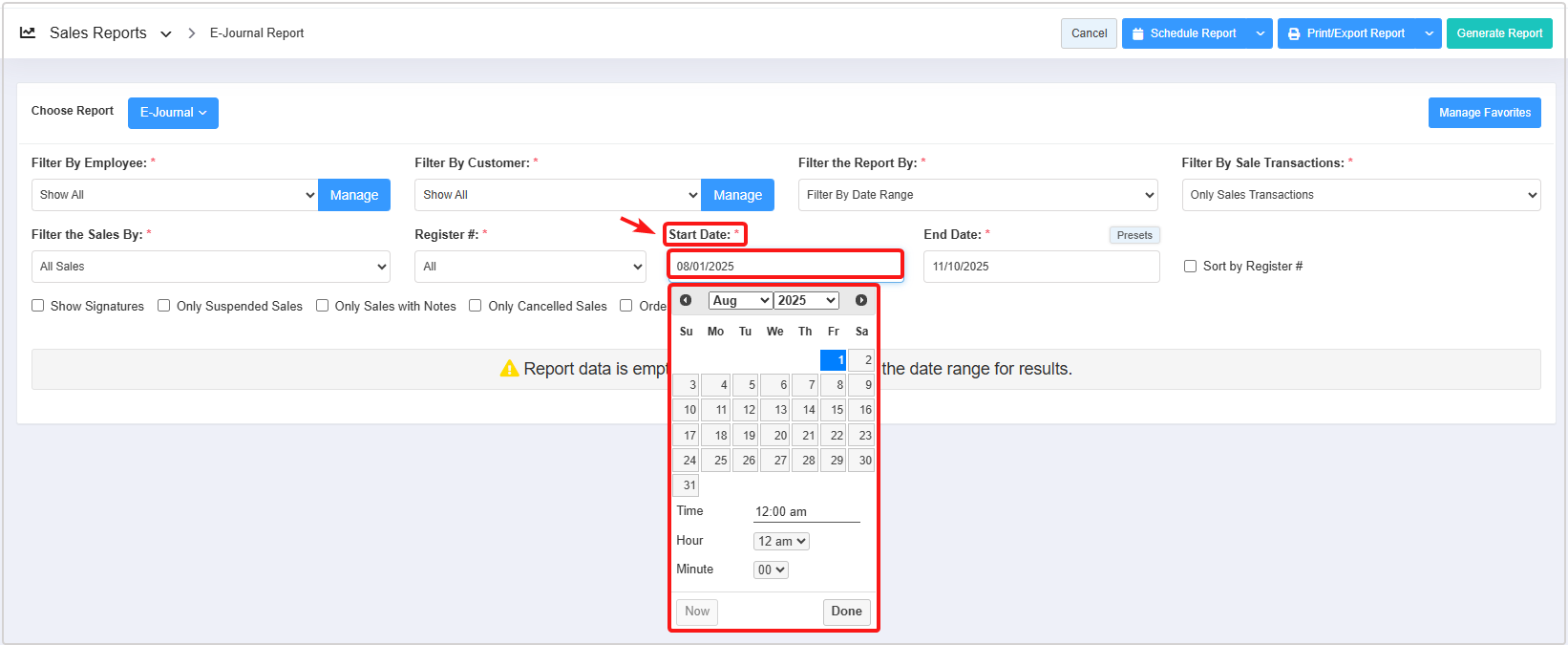 - Select the date range and click "Generate Report" to view the "E-Journal Report" for the selected date range.