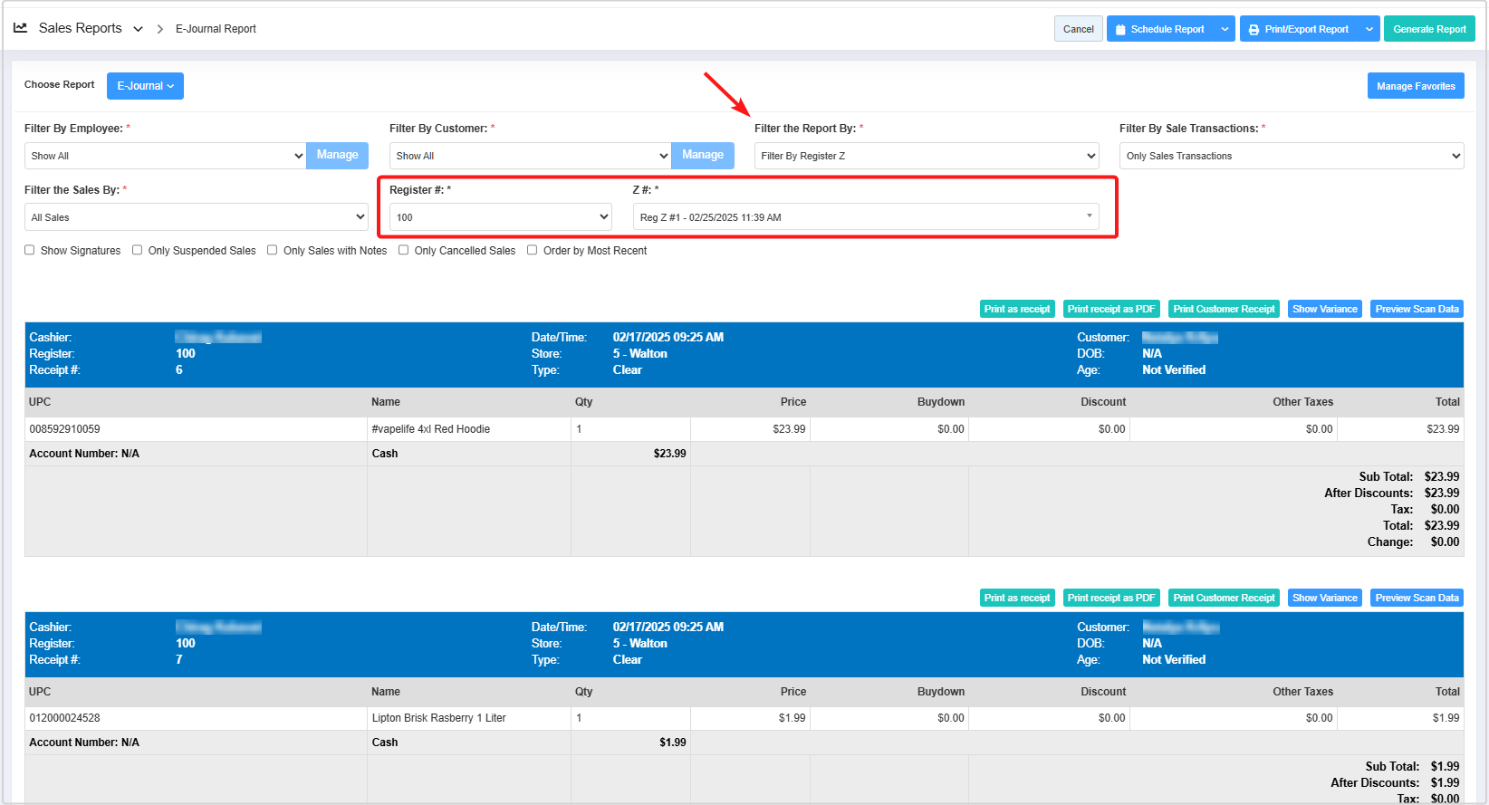 - Filter by Register Z: The Filter by Register Z report lets you view the report records for the specified Register Z. Please follow the steps below to get the report.