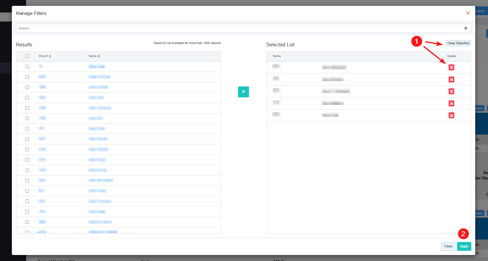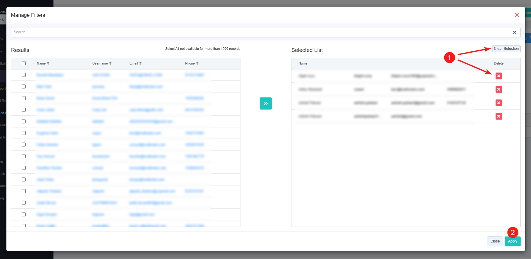 - 1: Clear Selection: Click the "Clear Selection" button to remove the whole selection. To remove any record from the list, click the Remove (x) icon.