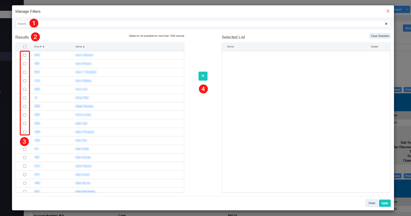 - 3: Selection Checkboxes: Select the required Employees by checking the appropriate checkboxes.