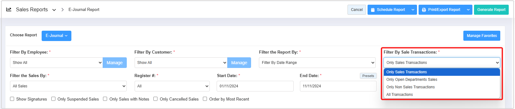 - Filter By Sales Transactions: This filter lets you generate the report based on four options: Only Sales Transactions, Only Open Departments Sales, Only Non Sales Transactions, and All Transactions.
