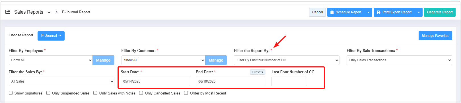 - Choose the Filter By Last Four Number of CC option in the Filter the Report By drop-down.