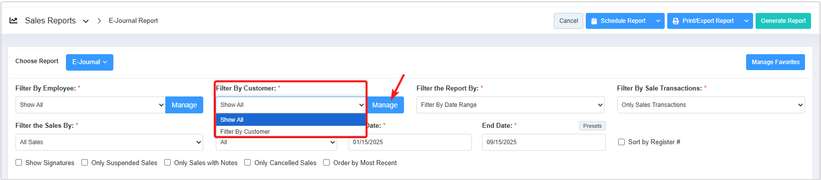 - In the Filter By drop-down menu, select the "Filter By Customer" option and click the "Manage" button.