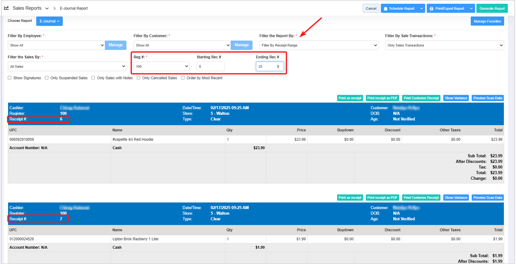 - Filter By Receipt Range: The Filter By Receipt Range option allows you to enter a range of receipt numbers to view only those sales. Please follow the steps below to get the report.