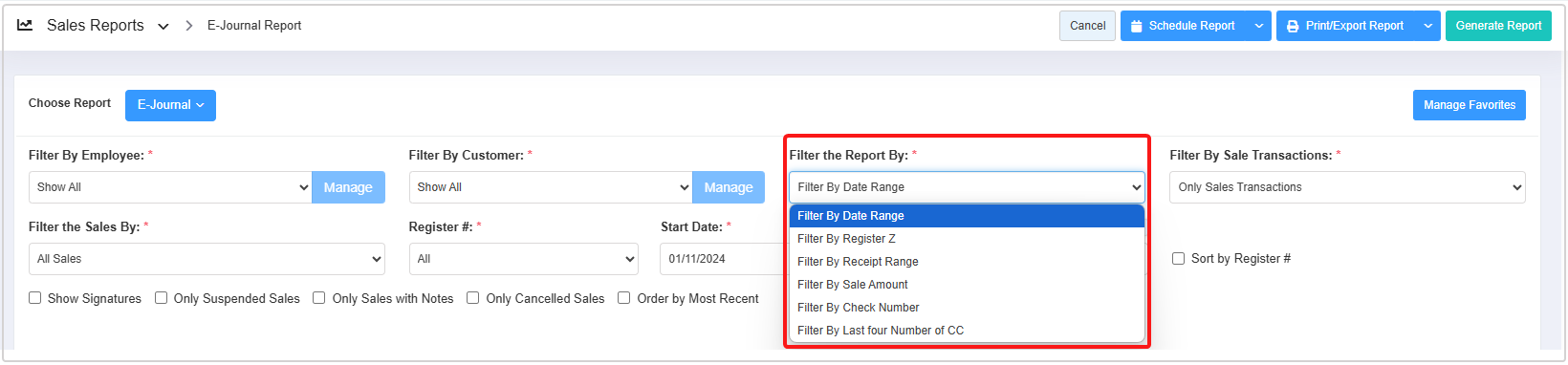 - Filter the Report By: This filter lets you generate the report based on six options: Filter By Date Range, Filter By Register Z, Filter By Receipt Range, Filter By Sale Amount, Filter By Check Number, and Filter By Last four Number of CC.