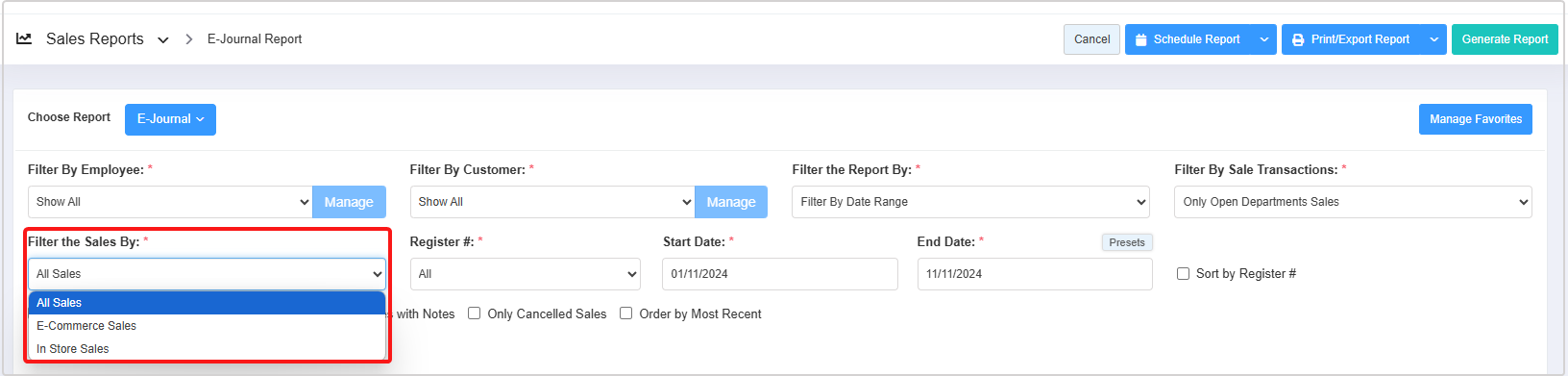 - Filter the Sales By: The Filter By Sales drop-down lets you view the report based on three parameters: All Sales, E-Commerce Sales, and In-Store Sales.