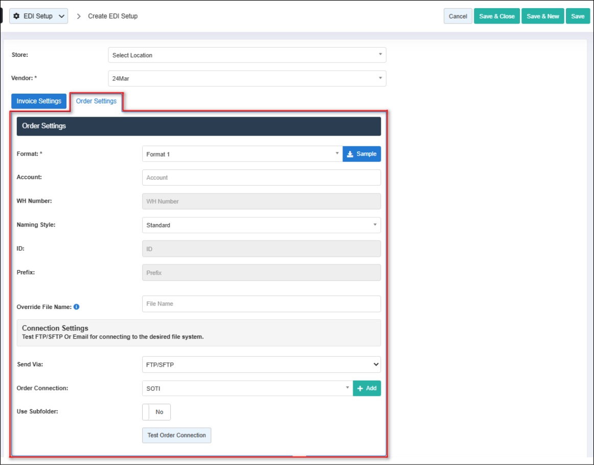Note: "FTP/SFTP Connection" could be managed separately by navigating to "Point of Sale -> Maintenance -> Vendors -> FTP Connection." You can check and understand through the FTP Connections KB/User Manual.1.3 Order Settings