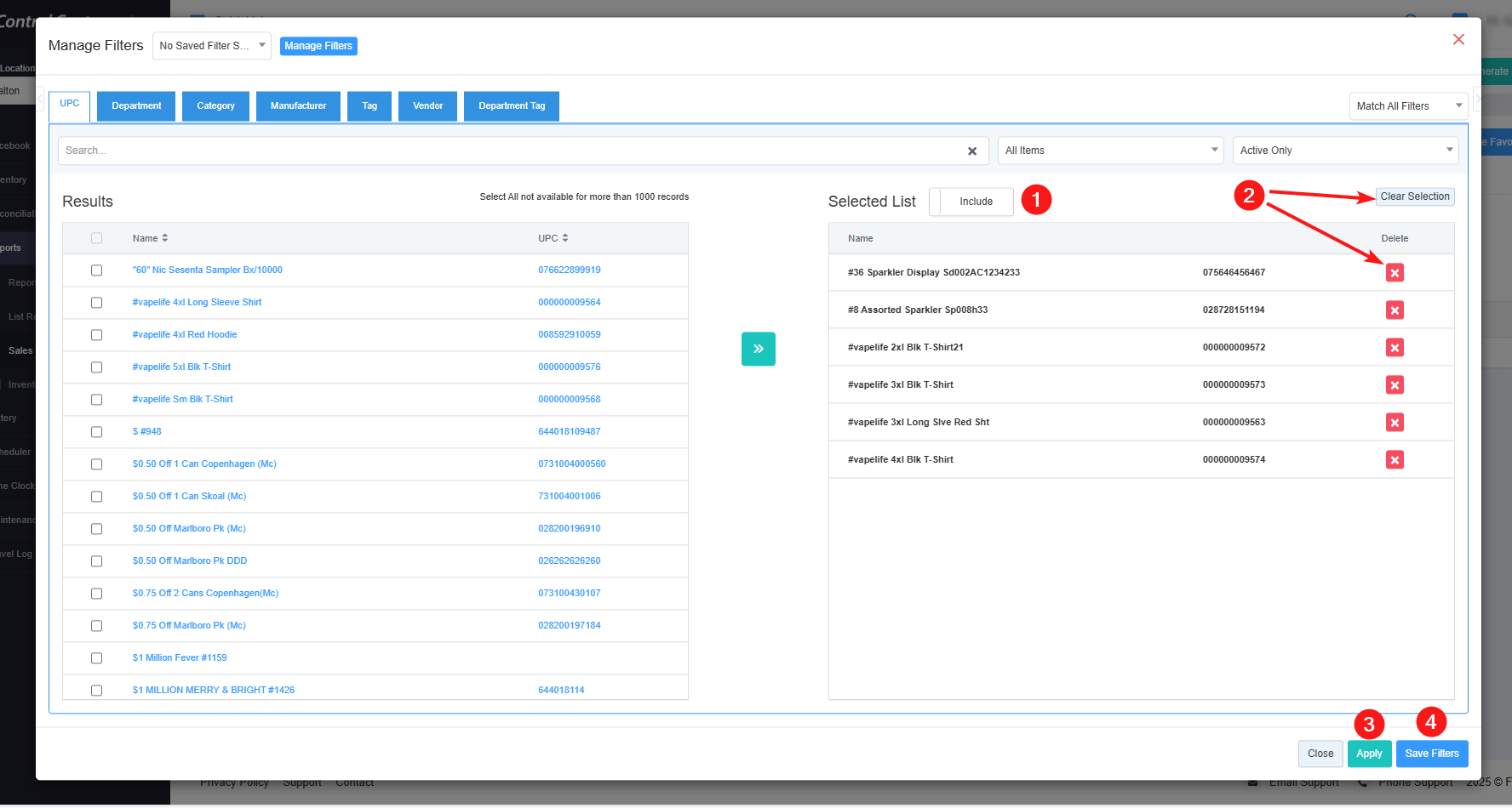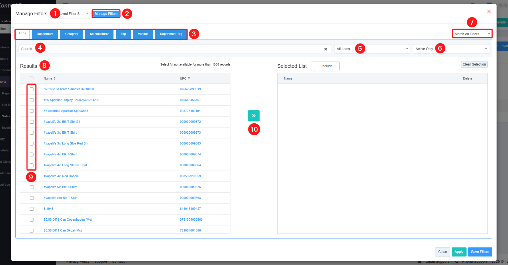 - 8: Results: Here, you see the relevant list of data on the Manage Filters screen for the selected tab. For example, if you have chosen the "UPC" tab, it will show the list of all UPCs. You can use the "Search" bar for a specific UPC. You will see the data accordingly if you have applied the 4, 5, 6, or 7 filters.