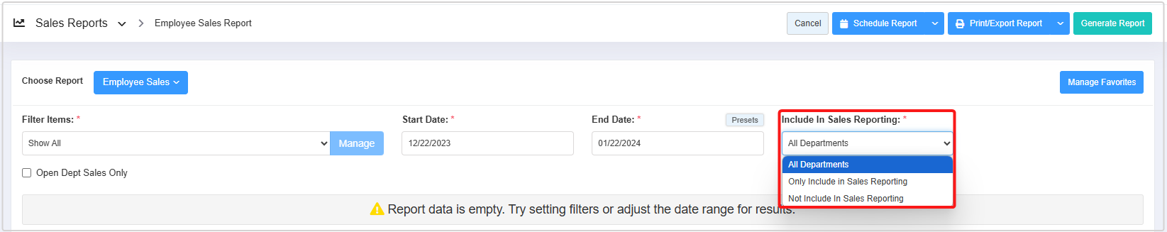 The Include In Sales Reporting drop-down allows you to filter the report records based on three parameters: All Departments, Only Include in Sales Reporting, and Not Include in Sales Reporting.