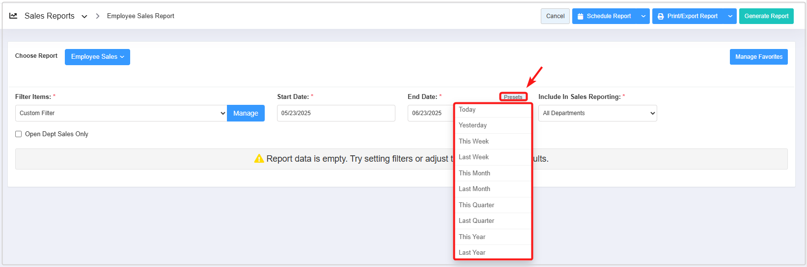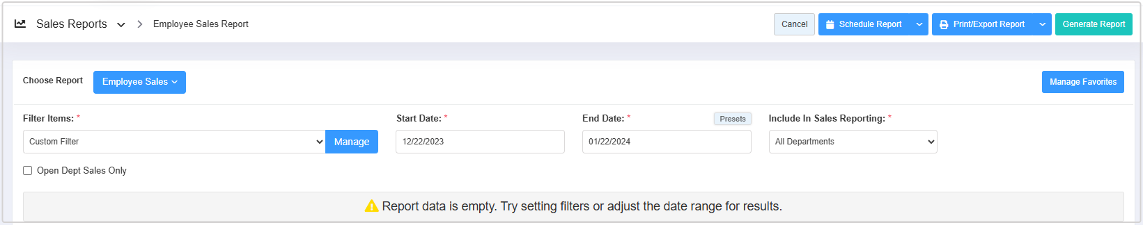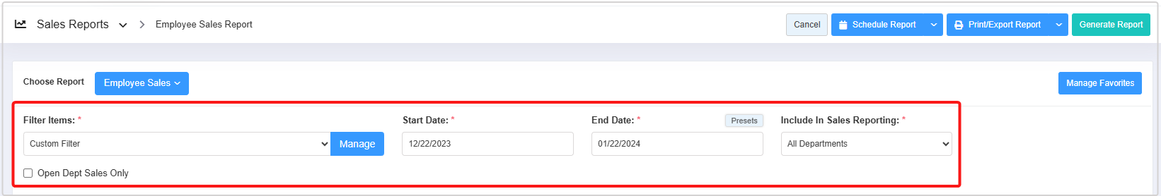- You can use the Filter Items (Custom Filters), Date Range & Presets, Include In Sales Reporting filters, and the Open Dept Sales Only checkbox filter to create the report that meets your requirements. You can use multiple filters to make the report more specific. Please refer to Section 3. Report Filter Options, to learn more about these filters.