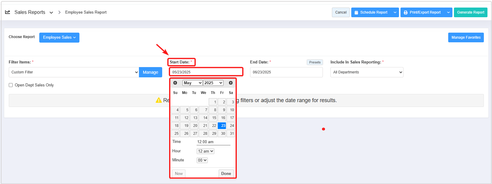 - Select the date range and click "Generate Report" to view the "Employee Sales Report" for the selected date range.