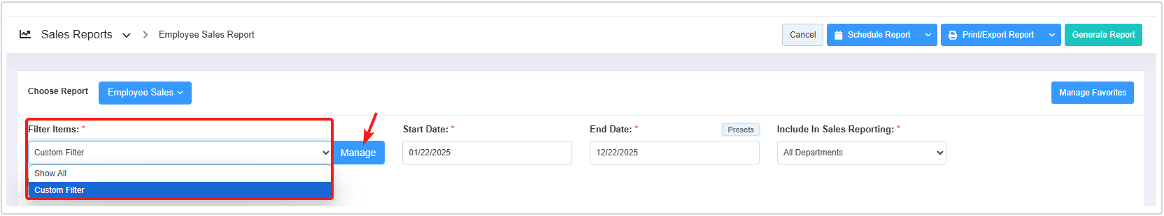 - 1: Saved Filters Drop-Down: Select the saved custom filters from the Manage Filters drop-down (if any) and click "Apply" to apply the saved custom filter. The system will redirect you to the Employee Sales Report home screen. Click "Generate Report" to generate the report for the selected filter.