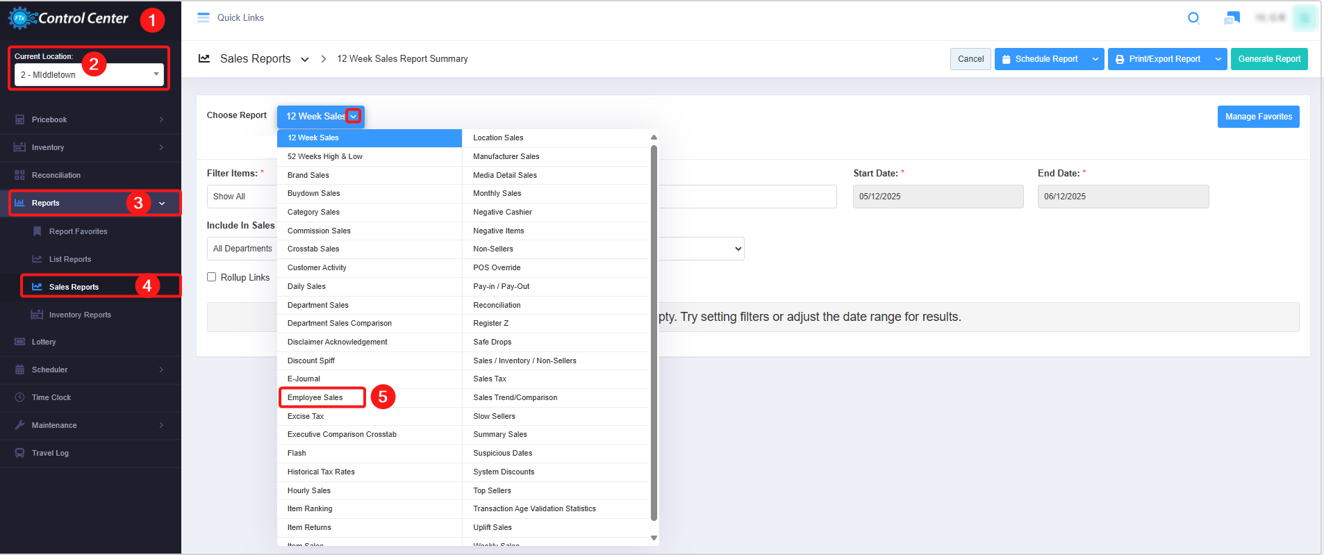 - 3: Apply: Click the "Apply" button for the selected parameters. The system will navigate you to the Employee Sales Report home screen. Click "Generate Report" to have the system generate reports based on your selection.