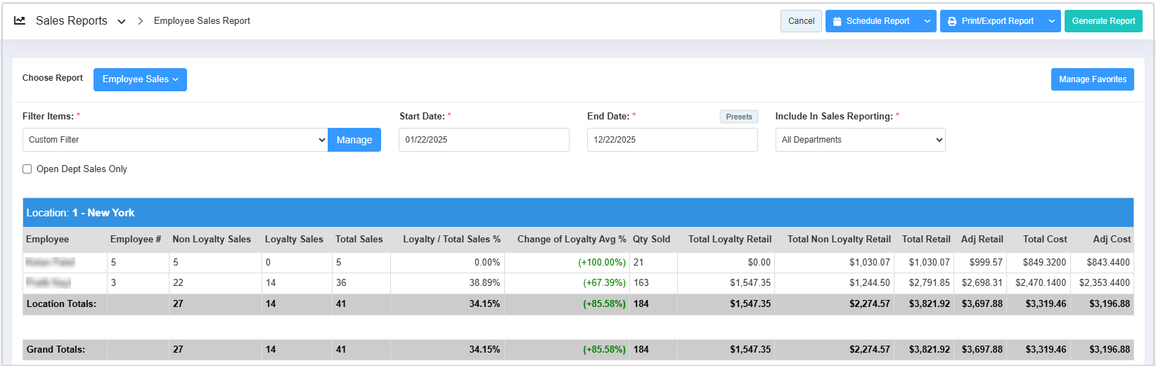 - Non-Loyalty Sales: This field gives the total number of non-loyalty sales transactions for the non-loyalty customers in the selected date range by the respective employee.