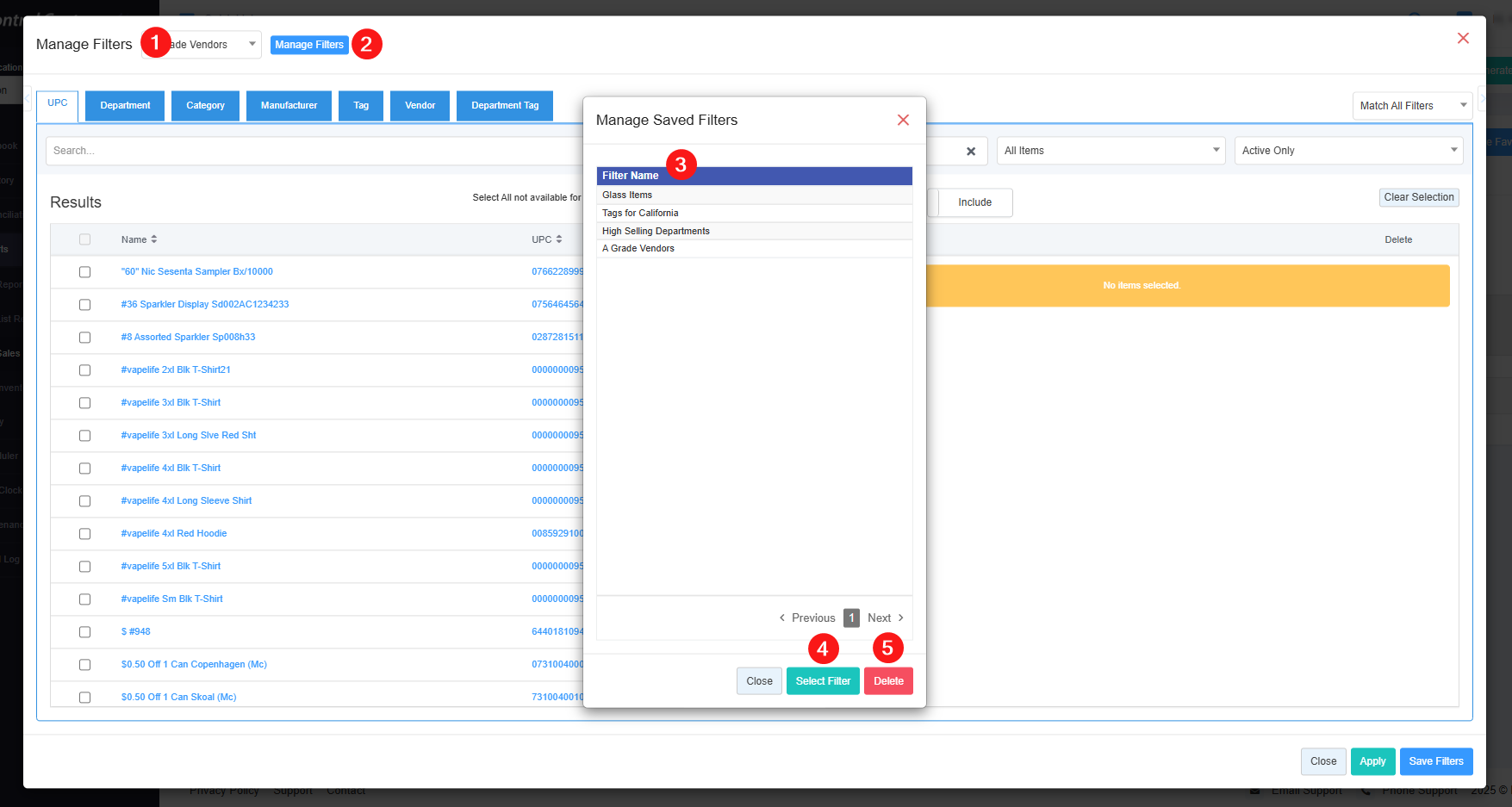 - 7: Match All Filters Drop-Down: The Match All Filters filter has two options, "Match All Filters" and "Match Any Filters." Select either option to determine whether the Manage Filters screen data matches all applied filters. This drop-down is particularly useful when you use multiple parameter tabs, such as when you choose a few UPCs from the "UPC" tab and a few vendors from the "Vendors" tab.