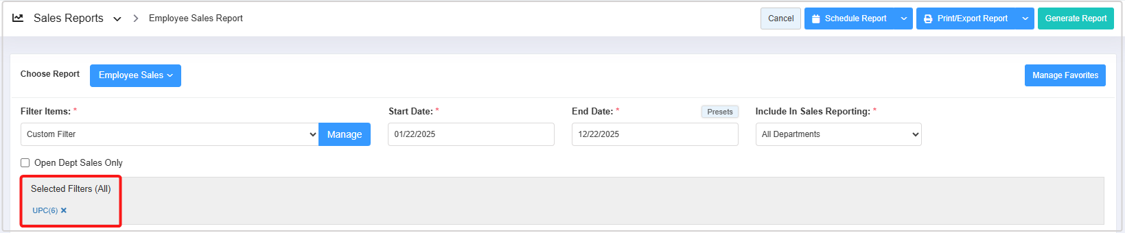 The Filter Items filter lets you view the report based on a selected parameter from seven options: UPC, Department, Category, Manufacturer, Tag, Vendor, and Department Tag. This means you can access the Employee Sales Report for the selected parameter, i.e., items (UPCs), departments, or any other parameter.