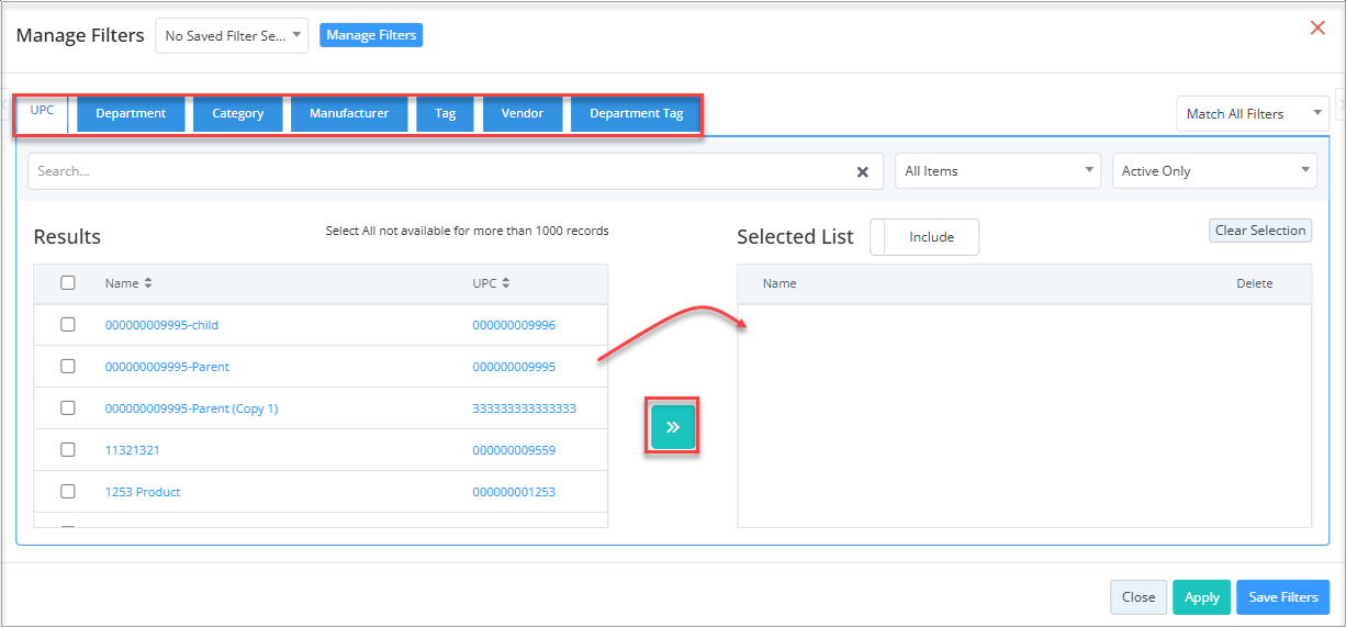 - You can select the saved custom filter from the drop-down selection. The "Manage Filters" button will open the list of the saved custom filters.