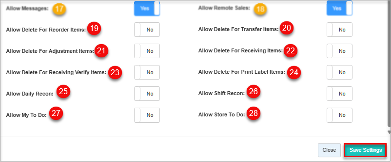 19. Allow Delete for Reorder Items: When set to Yes, employees can delete items from a reorder list on the Handheld. When set to No, items added to reorder cannot be removed on the Handheld.