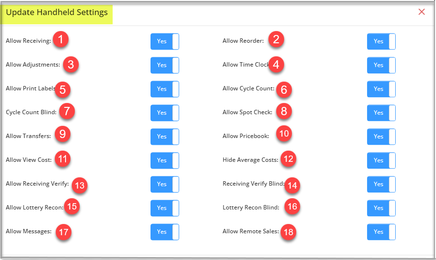 - Allow Transfers: If this is set to True, it will allow the employee to handle transfers from the handheld device.