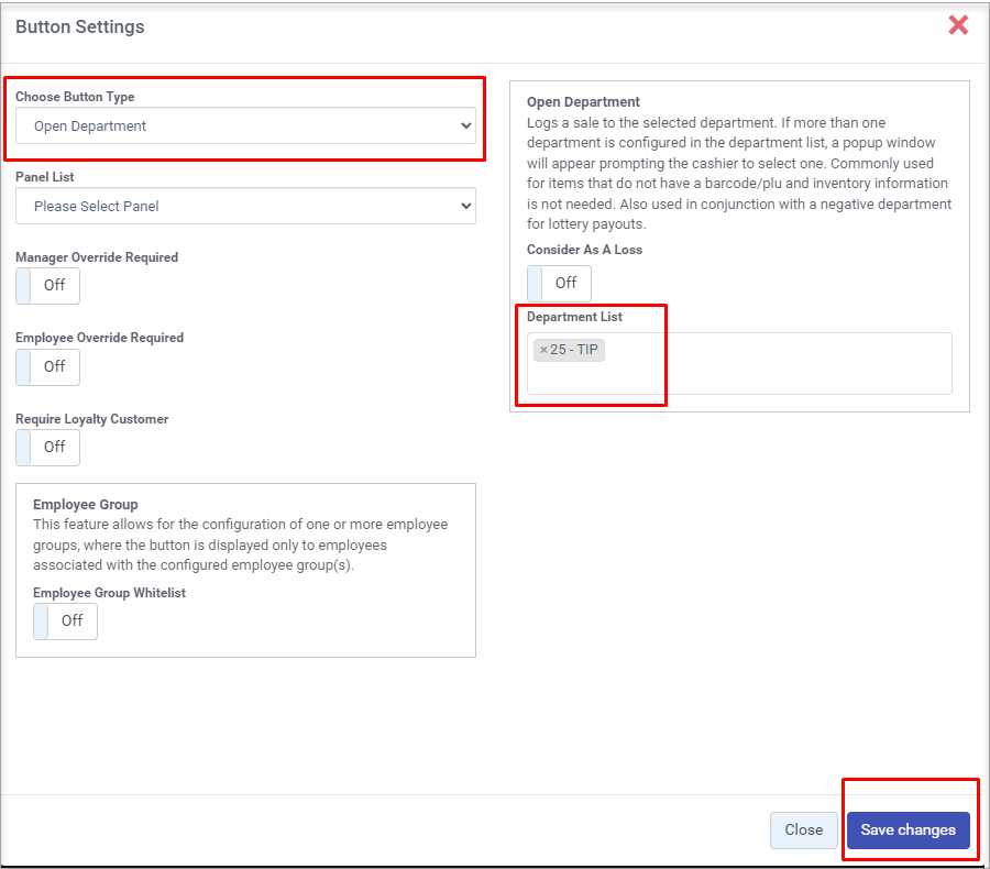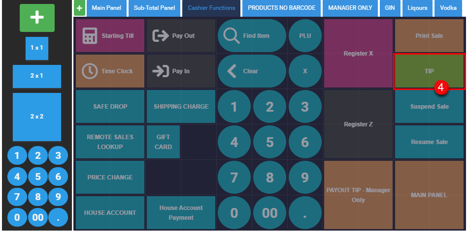 The next step is to create a Tip button. This will effectively be an "Open Department" button, which should be assigned to the TIP Department we created earlier. To use this button, you will first want to input the tip amount specified by the customer using the numerical pin pad on the display.