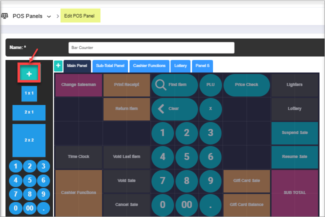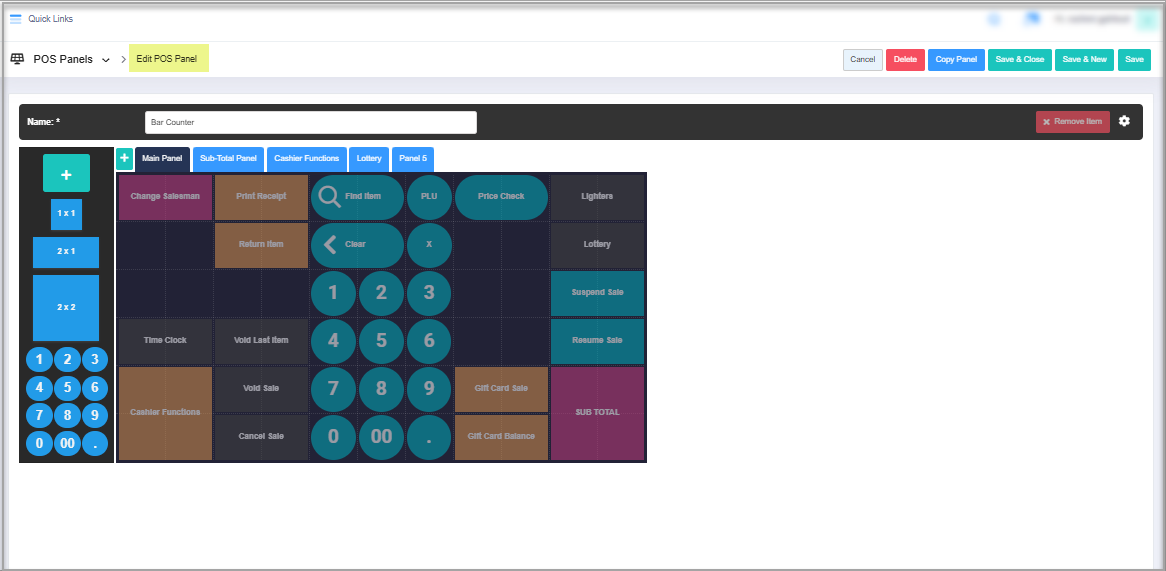 To get to the panels, navigate to Point Of Sale >> Maintenance >> Settings & Panels and choose "POS Panels" at the top of the page. Select the panel set you wish to work on. See Figure 1.2.