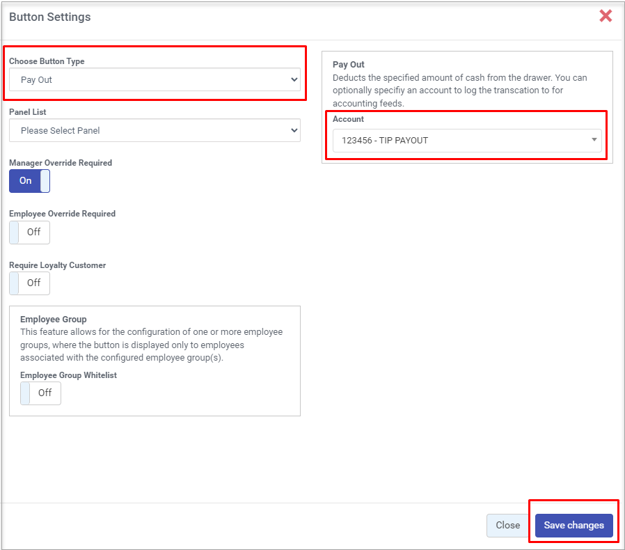 5. Payout Tip-Manager Only Button Settings: Select Button Type as Pay Out, and under Account, choose the Payout Account that corresponds to its account code created in the Pay in/out Account.