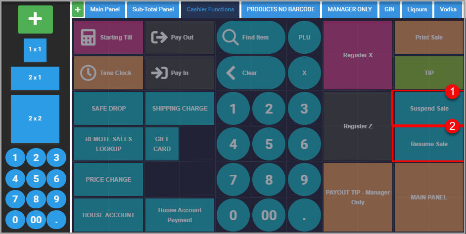 The first two buttons you will want to add will be a "Suspend Sale" and "Resume Sale" button. See Figure 1.6 below.