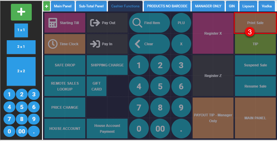 Next, you will want to add a "Print Sale" button. See Figure 1.9. This button will allow you to print out a receipt detailing all line items associated with the customer's open tab/consecutive purchases, which also has two additional fields: Tip and Total fields, respectively.