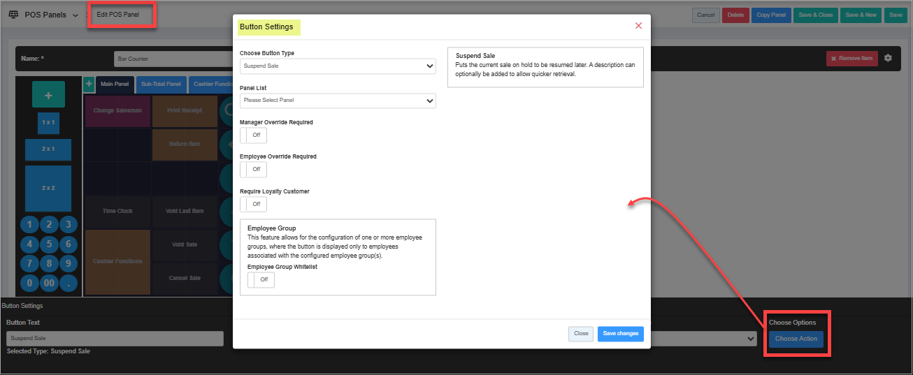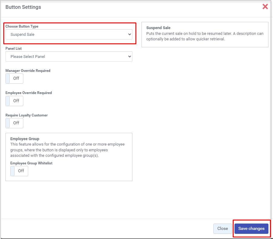 1. Suspend Sales Button Settings: Choose the button type as Suspend Sales from the drop-down list.