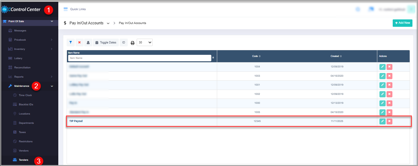 See Figure 1.0. You also want to create a Payout Account for the tips, which can be done by navigating to Point Of Sale > Maintenance> Tenders and then clicking on the "Pay In/Out Accounts" tab at the top of the page.