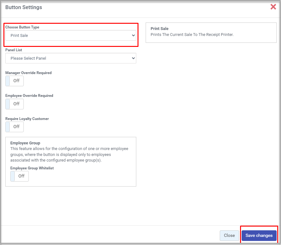 3. Print Sale Button Settings: Choose the button type as Print Sales from the drop-down list.